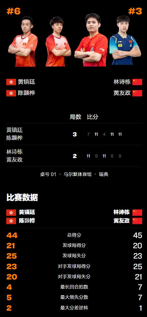 第五局林诗栋/黄友政开局不利1-3落后随即叫出暂停进行调整,紧接着继续追分试图翻盘,在3-5交换场地后继续被压制4-7落后,追至6-7只差1分后逼黄镇廷/陈颢桦用掉暂停权。再次投入战斗后,林诗栋/黄友政发挥不佳7-10落后,挽救1个赛点后仍然以8-11败北,由此而与冠军擦肩而过,令人感到惋惜。